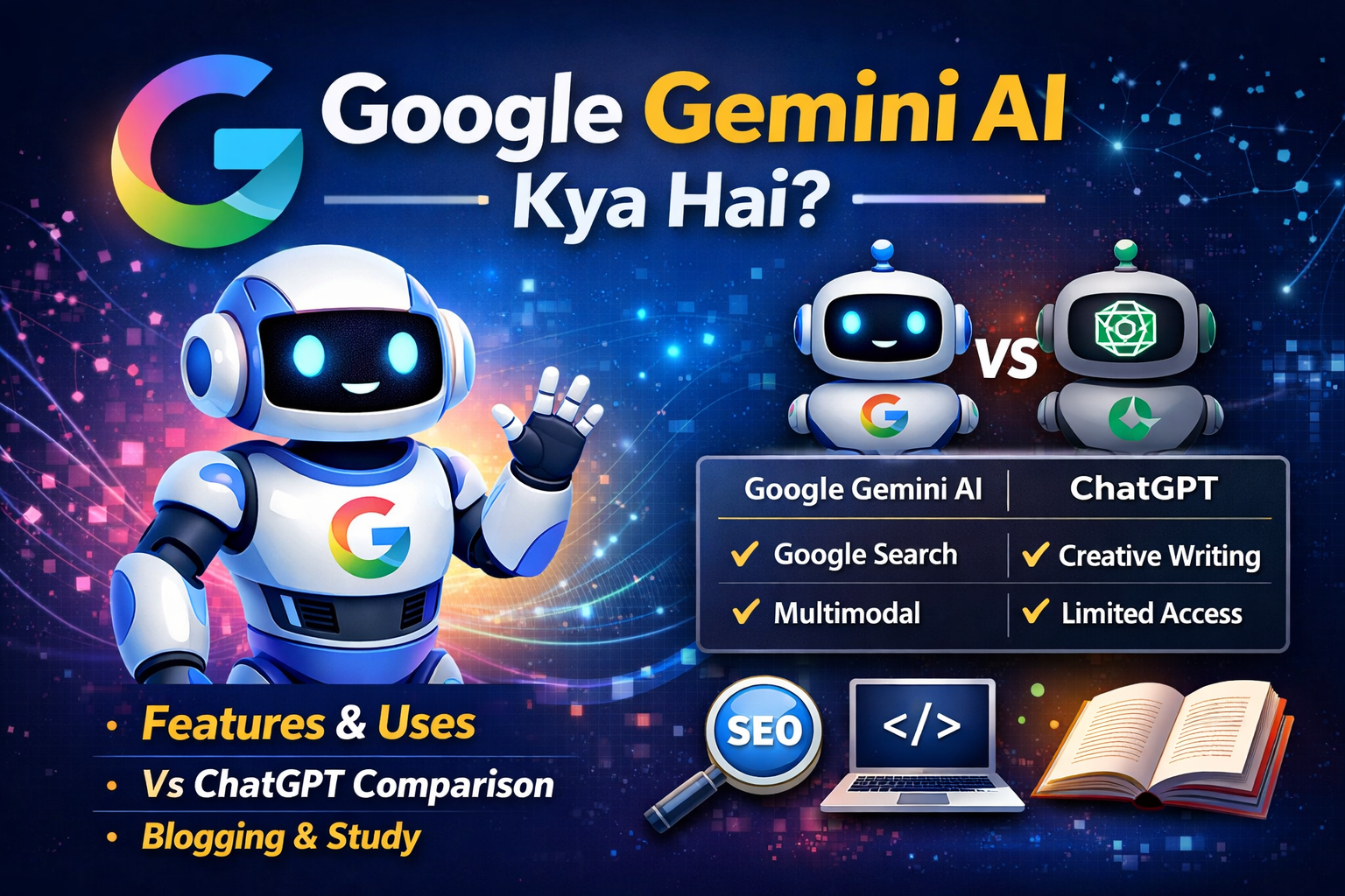 Google Gemini AI future ka ek powerful AI tool hai jo blogging, study, coding aur digital marketing sab me kaam aata hai.